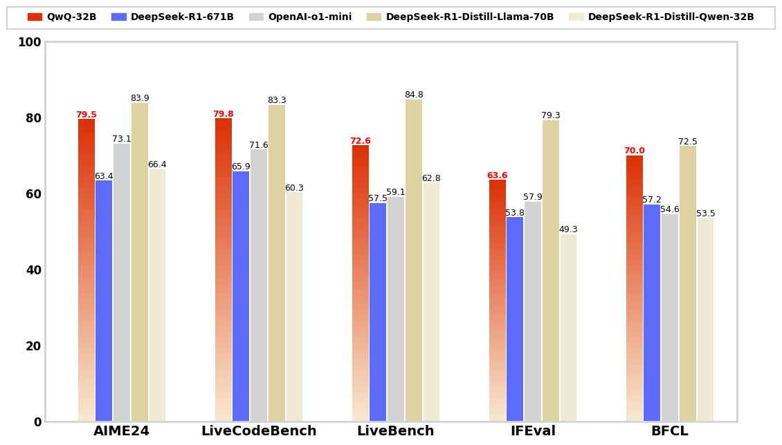 ``` import matplotlib.pyplot as plt import numpy as np from matplotlib.patches import Rectangle from matplotlib.ticker import FixedLocator, FixedFormatter # 数据 models = ['QwQ-32B', 'DeepSeek-R1-671B', 'OpenAI-o1-mini', 'DeepSeek-R1-Distill-Llama-70B', 'DeepSeek-R1-Distill-Qwen-32B'] benchmarks = ['AIME24', 'LiveCodeBench', 'LiveBench', 'IFEval', 'BFCL'] data = [ [79.5, 79.8, 72.6, 63.6, 70.0], [63.4, 65.9, 57.5, 53.8, 57.2], [73.1, 71.6, 59.1, 57.9, 54.6], [83.9, 83.3, 84.8, 79.3, 72.5], [66.4, 60.3, 62.8, 49.3, 53.5] ] # 颜色值 colors = ['#dd3005', '#5c6bf8', '#d3d3d3', '#ded1a2', '#efead3'] # 创建图表 fig, ax = plt.subplots(figsize=(12, 8)) # 设置图表尺寸为 12 英寸宽、8 英寸高 # ==================== 可调节参数 ==================== legend_y_offset = 1.15 # 控制图例垂直位置(越大距离柱状图越远) legend_shift = -0.05 # 控制图例和矩形框整体下移的距离(负值表示下移) rect_padding = 0.02 # 矩形框内边距 rect_linewidth = 1.5 # 矩形框线宽 rect_color = '#d3d3d3' # 矩形框颜色(浅灰色) # 自定义空白长度(单位为英寸) top_margin_inch = 1.5 # 图表顶部留白 bottom_margin_inch = 1.0 # 图表底部留白 left_margin_inch = 1.0 # 图表左侧留白 right_margin_inch = 1.0 # 图表右侧留白 # 获取当前图表的总宽度和高度(单位为英寸) fig_width_inch, fig_height_inch = fig.get_size_inches() # 计算比例 top_margin_ratio = top_margin_inch / fig_height_inch bottom_margin_ratio = bottom_margin_inch / fig_height_inch left_margin_ratio = left_margin_inch / fig_width_inch right_margin_ratio = right_margin_inch / fig_width_inch # 自定义 y 轴范围 y_min = 0 # y 轴最小值 y_max = 100 # y 轴最大值 # ================================================== width = 0.12 gap_within_group = 0.01 gap_between_groups = 0.15 x = range(len(benchmarks)) offset = 0.15 # 计算 x 轴范围 left_edge = -offset right_edge = len(benchmarks) - 1 + 2 * offset + gap_between_groups * (len(benchmarks) - 1) ax.set_xlim(left_edge, right_edge) # 定义渐变色函数 def gradient_color(height, color_top="#dd3005", color_bottom="#f8e9d0"): gradient = np.linspace(0, 1, 256).reshape(-1, 1) gradient = np.hstack((gradient, gradient)) cmap = plt.cm.colors.LinearSegmentedColormap.from_list("gradient", [color_bottom, color_top]) return cmap(gradient) # 绘制柱状图 for i in range(len(models)): positions = [xi + offset + (width + gap_within_group) * i for xi in x] if i == 0: for j, pos in enumerate(positions): height = data[i][j] ax.imshow(gradient_color(height), extent=[pos - width / 2, pos + width / 2, 0, height], aspect="auto", origin="lower") else: ax.bar(positions, data[i], width, color=colors[i]) for j, pos in enumerate(positions): height = data[i][j] ax.text(pos, height, '%.1f' % data[i][j], ha='center', va='bottom', fontsize=9, color='red' if i == 0 else 'black', fontweight='bold' if i == 0 else 'normal') # 设置轴标签和样式 ax.set_xticks([p + offset + (width + gap_within_group) * (len(models) - 1) / 2 for p in x]) ax.set_xticklabels(benchmarks, fontsize=14, fontweight='bold') # ax.set_ylabel('Scores', fontsize=14, fontweight='bold') # 设置 y 轴范围 ax.set_ylim(y_min, y_max) # 设置 y 轴数字加粗 y_ticks = ax.get_yticks() # 获取当前 y 轴刻度值 y_tick_labels = [f'{int(tick)}' for tick in y_ticks] # 格式化刻度标签 # 使用 FixedLocator 和 FixedFormatter ax.yaxis.set_major_locator(FixedLocator(y_ticks)) # 设置刻度位置 ax.yaxis.set_major_formatter(FixedFormatter(y_tick_labels)) # 设置刻度标签 for label in ax.get_yticklabels(): label.set_fontsize(12) # 设置字体大小 label.set_fontweight('bold') # 设置字体加粗 for spine in ax.spines.values(): spine.set_color('#d3d3d3') spine.set_linewidth(2.0) ax.tick_params(axis='both', which='both', length=0) # 创建图例并设置文本加粗 legend_elements = [Rectangle((0, 0), 1, 1, color=c, label=m) for m, c in zip(models, colors)] legend = ax.legend(handles=legend_elements, loc='upper center', bbox_to_anchor=(0.5, legend_y_offset + legend_shift), # 放置在柱状图上方 ncol=len(models), fontsize=10, prop={'weight': 'bold'}, # 设置图例文本加粗 frameon=False, columnspacing=1.5, # 增大列间距以均匀分布 handletextpad=0.5, # 图例标记与文本之间的间距 handlelength=1.5) # 图例标记长度 # 获取图例的边界框 fig.canvas.draw() legend_bbox = legend.get_tightbbox(fig.canvas.get_renderer()) legend_bbox = legend_bbox.transformed(fig.transFigure.inverted()) # 动态计算矩形框的宽度和高度 rect_x = 0.5 - (legend_bbox.width / 2 + rect_padding) # 水平居中 rect_width = legend_bbox.width + 2 * rect_padding # 矩形框宽度 rect_y = legend_bbox.ymin - legend_bbox.height-2.5*rect_padding # 垂直居中 rect_height = 2 * rect_padding # 矩形框高度 # 绘制矩形框 rect = Rectangle((rect_x, rect_y), rect_width, rect_height, transform=fig.transFigure, edgecolor=rect_color, # 浅灰色 facecolor='none', linewidth=rect_linewidth, # 加粗 clip_on=False) fig.patches.append(rect) # 自定义左右上下留白距离 plt.subplots_adjust( top=1 - top_margin_ratio, # 上方留白 bottom=bottom_margin_ratio, # 下方留白 left=left_margin_ratio, # 左侧留白 right=1 - right_margin_ratio # 右侧留白 ) # 保存为 1200x800 像素的 PNG 图片 plt.savefig('1.png', dpi=100, bbox_inches='tight') # 设置 dpi=100,确保分辨率为 1200x800 # 如果需要展示图表,可以保留下面这行代码(存在bug---show和savefig生成图片不一致,我这里确保savefig是对的) # plt.show() ```